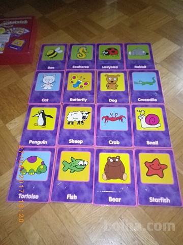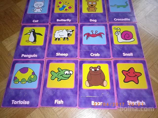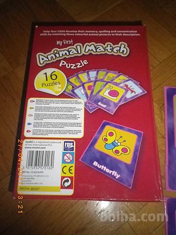 Grafixove originalne 16 delne puzzle z motivom živali. Sestaviti je potrebno žival in ustrezni delček, na katerem je napisano angleško ime za določeno žival (ne paše vsak spodnji del na vsak zgornji del, mora se ujemati kot puzzle). Kartice so narejene iz tršega kartona, kupljeno je pa bilo v Angliji. Zato je igra redka in še toliko bolj posebna. Kot je napisano na škatli, igra pomaga razvijati spomin pri otrocih, izgovorjavo ter veščine koncentracije. Ohranjenost vsega je lepa - glejte slike.