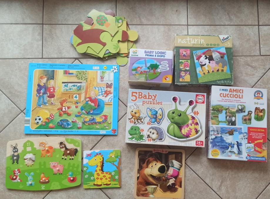 Prodam v kompletu več otroških puzlov in drugih sestavljank. Tri so lesene, starostno so od 18 mesecev do 3 leta. Skupaj več kot 10 sestavljank. Vse so popolne. Prevzem v Novi Gorici oz. okolici. Lahko po pošti, poštnina cca 5€.