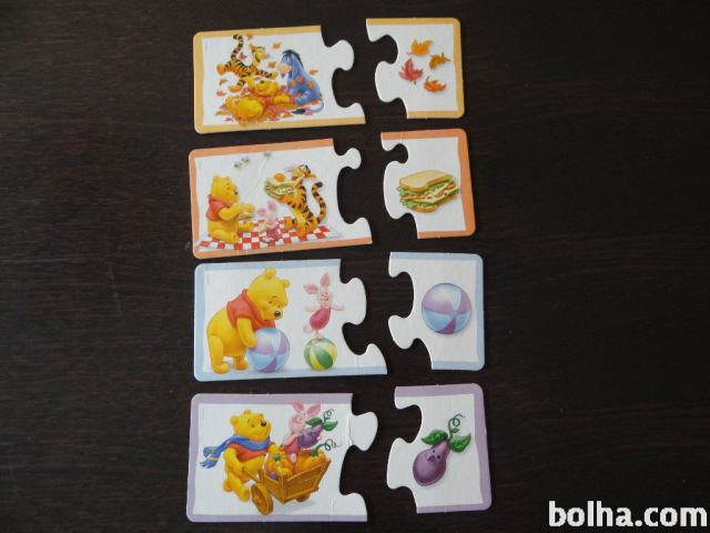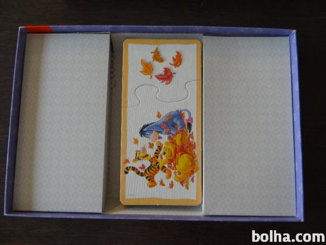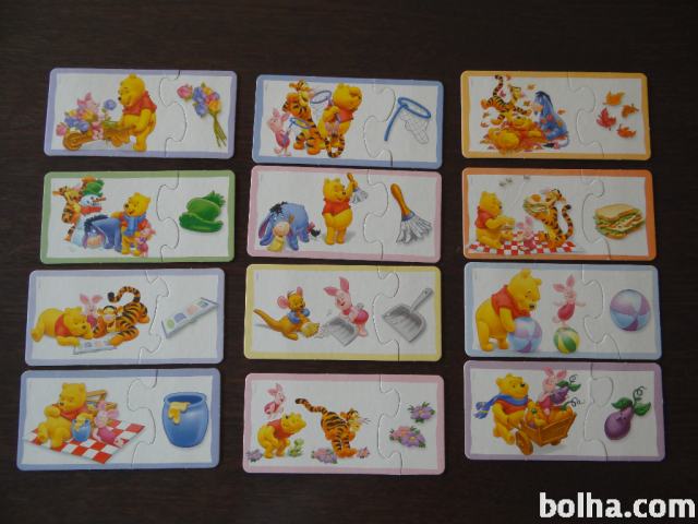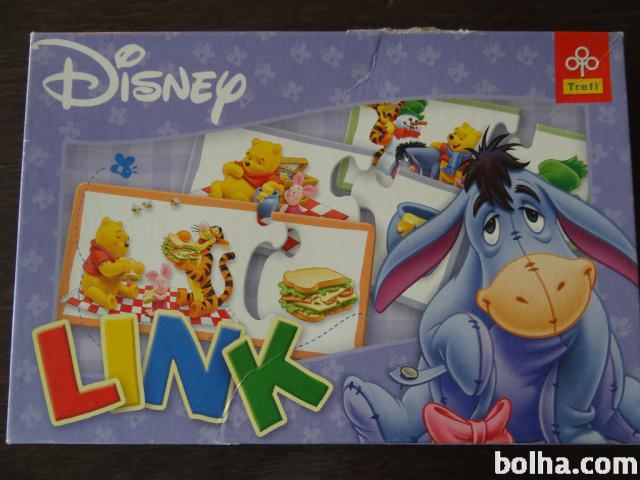 Ugodno prodam izredno poučne puzzle LINK Disney, kjer otrok poišče ustrezen par in ga sestavi kot sestavljanko oz. puzzle. Primerna za starost od 3 do 6 let, lahko se otrok igra sam ali s še enim igralcem, s katerim tekmuje, kdo zbere več parov. Poiskati je potrebno 12 parov ustreznih slik.
