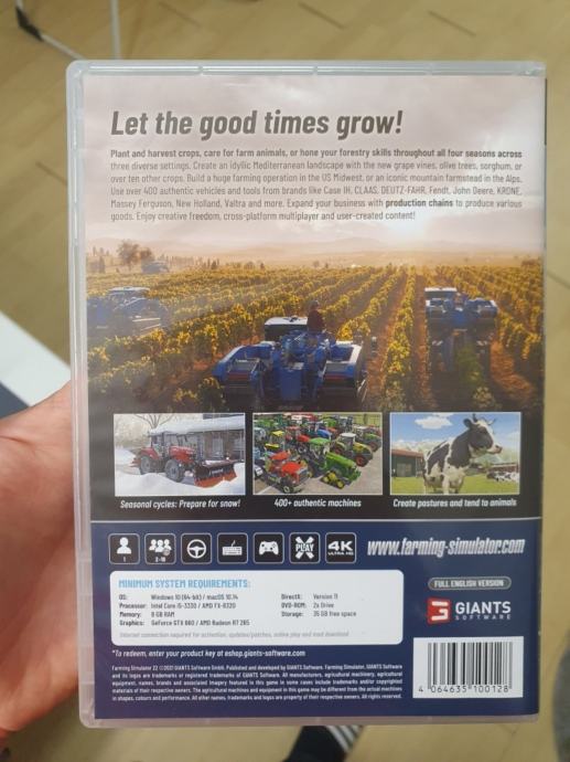 Prodam rabljeno PC igro Farming Simulator 22 v dobrem stanju. Igra ponuja realistično kmetijsko simulacijo z različnimi stroji, letnimi časi in možnostjo upravljanja svoje kmetije. Vsebuje DVD nosilec in kodo za digitalni prenos.