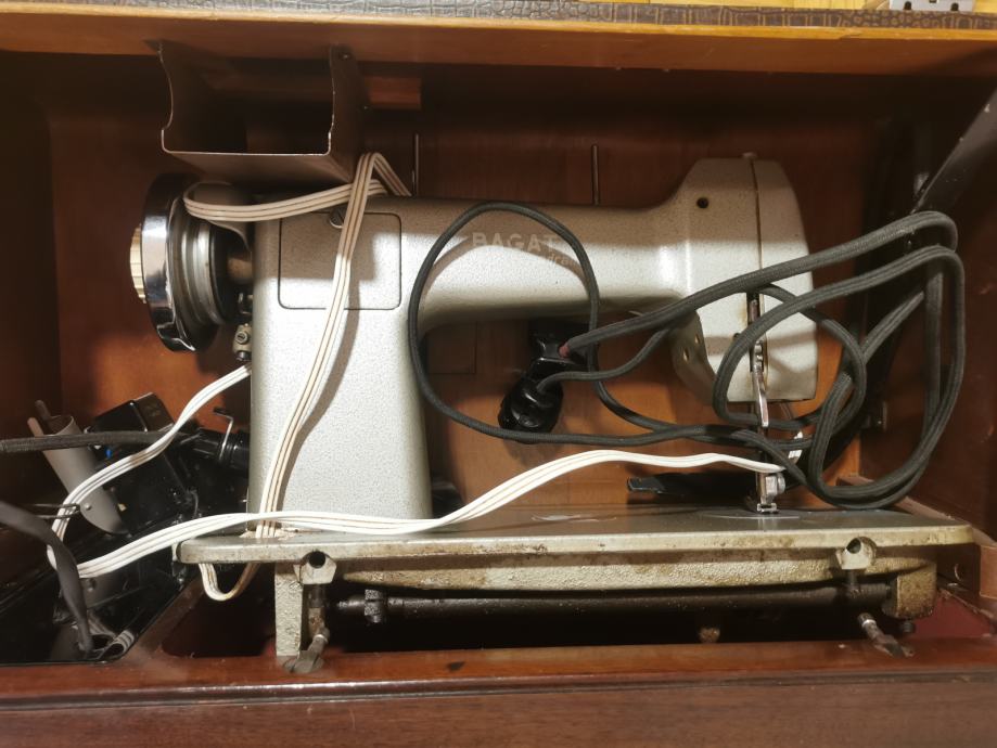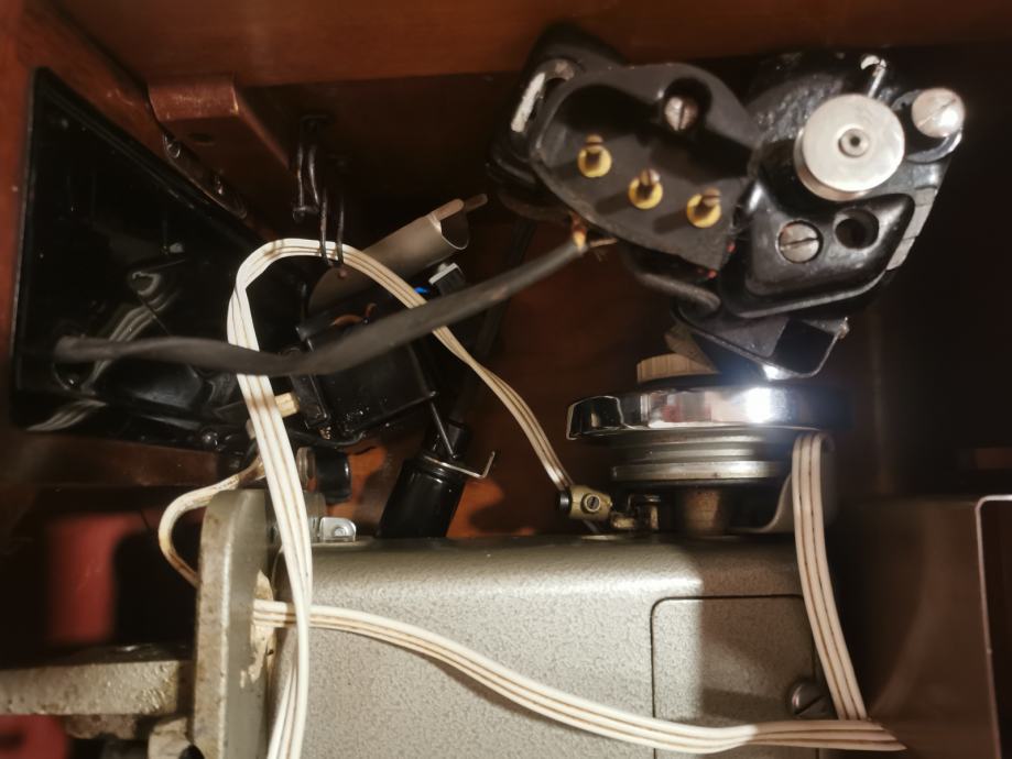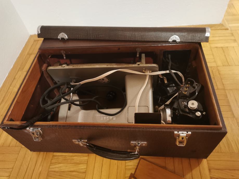 Stroj je v lesenem kovčku, ne vemo če dela in kako je z ostalim v celoti, če komu pride prav za dele ali za zabavo.