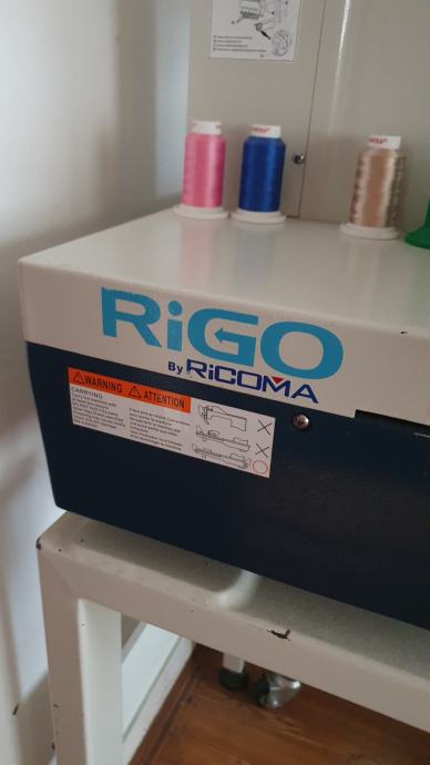Zaradi neuporabe prodam profesionalen industrijski vezilni stroj / stroj za vezenje Ricoma RJ-1201PT. Ena glava, 12 igel. Posebnost tega stroja je, da ima dodatno na zadnji barvi dodano še posebno napravo za šivanje bleščic (sequin). Nekaj primerov kako to izgleda je med slikami v oglasu.