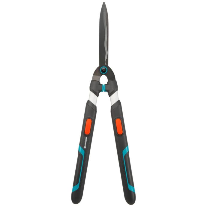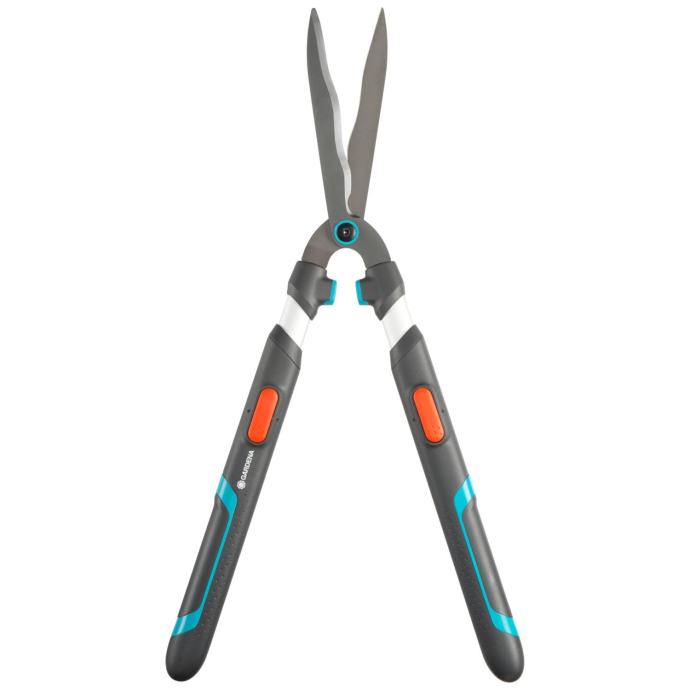 Ročne škarje za živo mejo Gardena TeleCut so praktičen pripomoček za vrt za obrezovanje večjih živih mej. Škarje za živo mejo nudijo posebej dobro rezalno silo in prijetno rokovanje. Obrežite svojo živo mejo natančno in poskrbite za urejeno skupno podobo svojega zunanjega prostora. Večji doseg s teleskopskimi ročajiRočne škarje za živo mejo imajo raztegljiva ročaja, ki omogočajo velik doseg. Tako lahko brez težav obrežete tudi zgornjo stran žive meje, brez napornega stegovanja ali uporabe lestve. Obenem izkoristite tudi daljšo ročico in lahko uporabite večjo silo. Skupno lahko dolžino ročajev podaljšate za 20 cm (od 70 cm na 90 cm).Škarje za živo mejo z valovitim brušenjem rezilRobustna rezila so izdelana iz natančno valovito brušenega jekla. Zaradi valovitega brušenje veje ali listi pri rezanju ne morejo zdrsniti in vedno režete v pravilnem kotu. S tem dosežete posebej čiste reze in obrezovanje večjih površin je zelo učinkovito. Dolžina reza znaša 23 cm in integrirani rezalnik vej omogoča nenaporno rezanje debelejših vej. Prevleka proti oprijemanju skrbi za pazljivo in natančno obrezovanje zelenih delov in obenem ščiti pred korozijo. Poleg tega olajšuje tudi čiščenje rezil. Ergonomska ročaja za preprosto rokovanjeZaradi izvedbe z aluminijasti ročaji so vrtne škarje posebej lahke in lahko prihranite moči. Ročaja ErgoTec prepričujete z uravnoteženo in ergonomsko obliko. Z mehkimi komponentami držala škarje posebej dobro ležijo v roki in nudijo boljši oprijem za idealen prenos sile. Omejevalni blažilnik iz specialne umetne mase varuje sklepe.