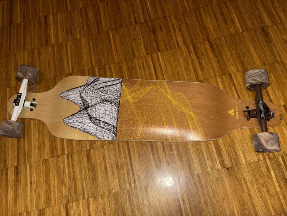 Prodajam longboard znamke Firefly. Kupljena je bila leta 2021 v Intersportu. Je kategorija oz. class a, kar pomeni da je primerna za uporabo od 20-100 kg. Longboard ni bil nikoli uporabljen niti sproban, saj nihče v družini ni talentiran za takšne zadeve. Kot lahko vidite, je okoli koles še ostanek plastičnega ovoja. Cena ni zadnja!