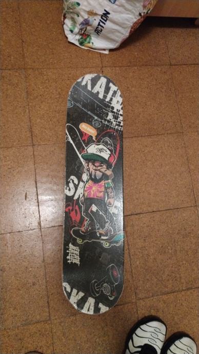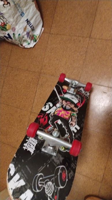 Je komaj rabljen, ima gumijasta kolesca, lesena deska, ima plastičen grip in ne brusni papir, je malo poškrampan po robovih drugace kot nov