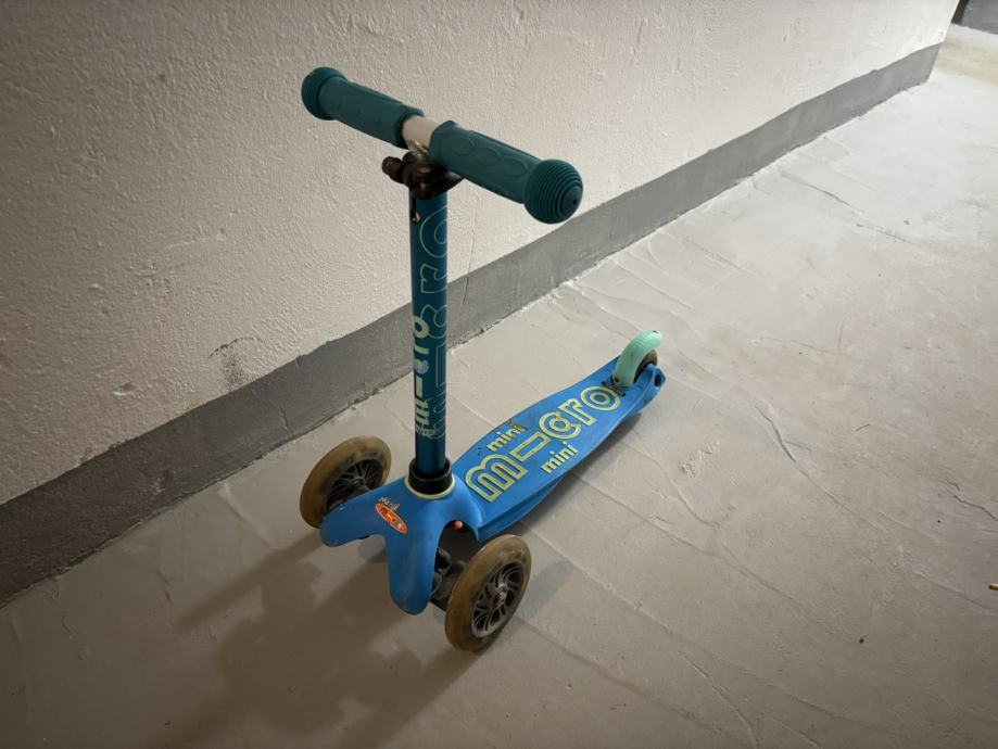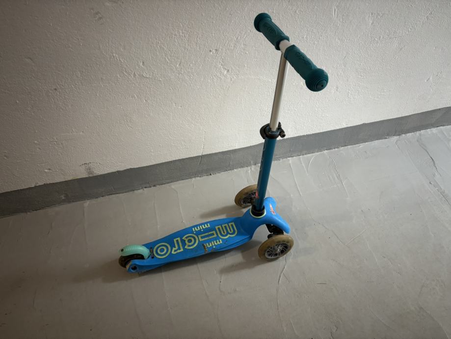 Otroški skiro Mini Micro deluxe. V temi se svetijo lučke v kolesih. Moč svetlobe odvisna od hitrosti vožnje.