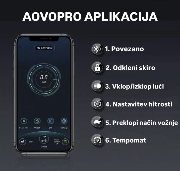 Električni skiro AovoPro vam ponuja moderen dizajn, lahkoten in kvaliteten aluminijast okvir z nosilnostjo do 120 kilogramov ter zmogljivost in varnost. Vgrajena polnilna baterija s kapaciteto 10.5Ah poskrbi za izjemno zmogljivost, moč motorja s 350W pa omogoča eno polnjenje v le petih urah in vam ponuja prevoženo razdaljo do 35 kilometrov. Največja dosežena hitrost lahko doseže kar 31 km/h, premore tudi vožnjo v klanec do 20 stopinj. Na voljo so vam tri prestave ter dvojna zavora – spredaj električna, zadaj disk zavora, ki se sprožita istočasno ob stisku ročice in poskrbita za varno in hitro zaviranje. Med pospeševanjem shranjuje kinetično energijo in jo pretvori v električno, zato ga lahko uporabljate še dlje. Za daljše poti vam je na voljo tempomat, v nastavitvah pa lahko izbirate tudi med takojšnjim štartom ali nekaj z zakasnitvijo. Skiro ima tudi pametno funkcijo ''poleg'', ki ob hoji zraven skiroja, le-tega poganja s hitrostjo hoje. Nastavite lahko tudi samo občutljivost zavor in hitrost pospeška.