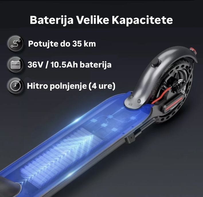 Vrhunske karakteristike: 31 km/h, 8.5 pnevmatike, dvojne disk zavore, 350W, 10.5Ah baterija, ABS, bluetooth, tempomat, barvni LCD, razdalja do 35 km, vodoodporen, brezplačna aplikacija itd.