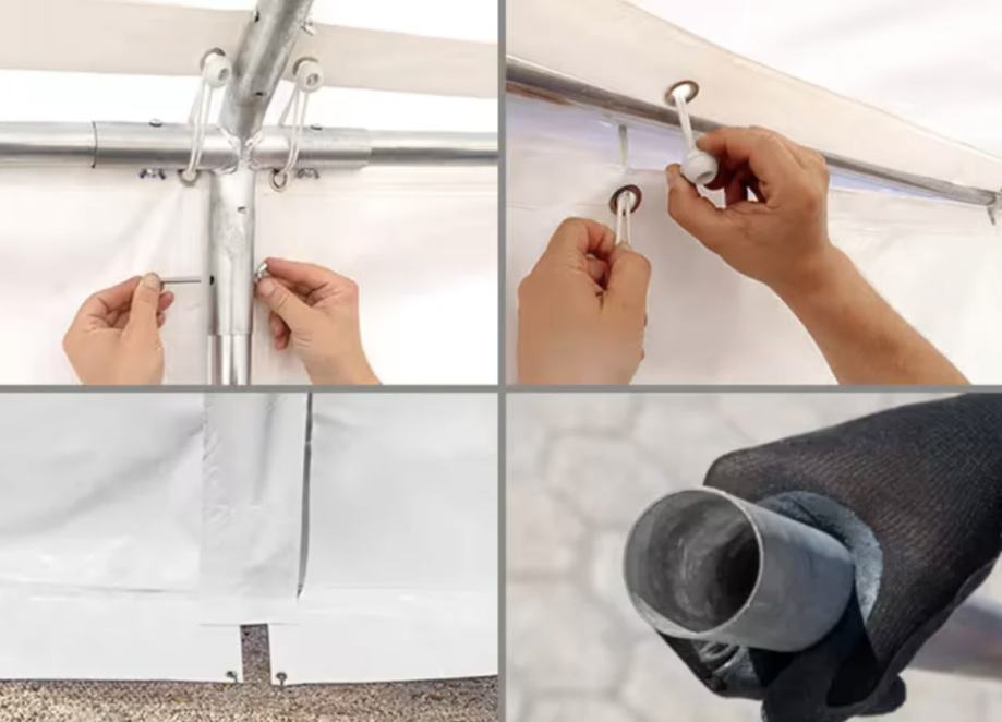Ekonomičen šotor za shranjevanje je popoln partner za individualne projekte s časovno omejitvijo. Sestavi se lahko neverjetno hitro, zahvaljujoč prilagodljivi konici in stranskim stenam, ki se lahko uporabljajo neodvisno, kar omogoča popolno prilagajanje posebnim potrebam. Ekonomičen šotor za shranjevanje ima okvir, ki ga je mogoče enostavno sestaviti iz popolnoma pocinkanega, odpornega proti koroziji jekla, in robustno PVC cerado, ki tehta približno 700 g/m². Ta vrhunska PVC cerada nudi superiorno zaščito pred soncem z zaščitnim faktorjem 80+, UV odpornostjo in 100% vodoodpornostjo zaradi varjenih šivov.