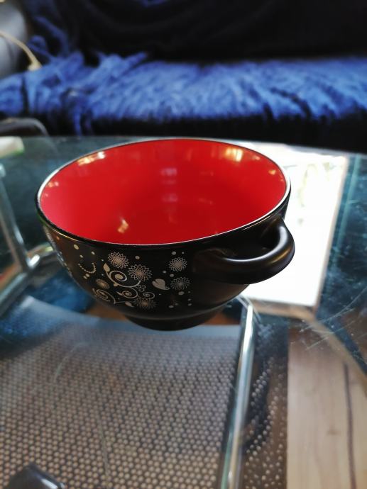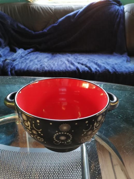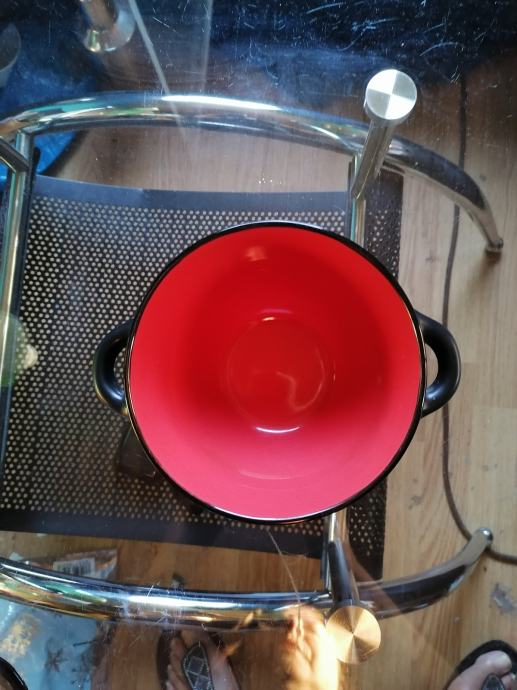 V notranjosti je rdeče barve,na zunanji strani je črne barve in lepo vzorčasta. Takšna kot na fotografijah. Njene mere : premer 14cm,višina 8cm. Odlično ohranjena,kot nova. Tel.064 222 880,pošljem po navadni pošti ali osebni prevzem.