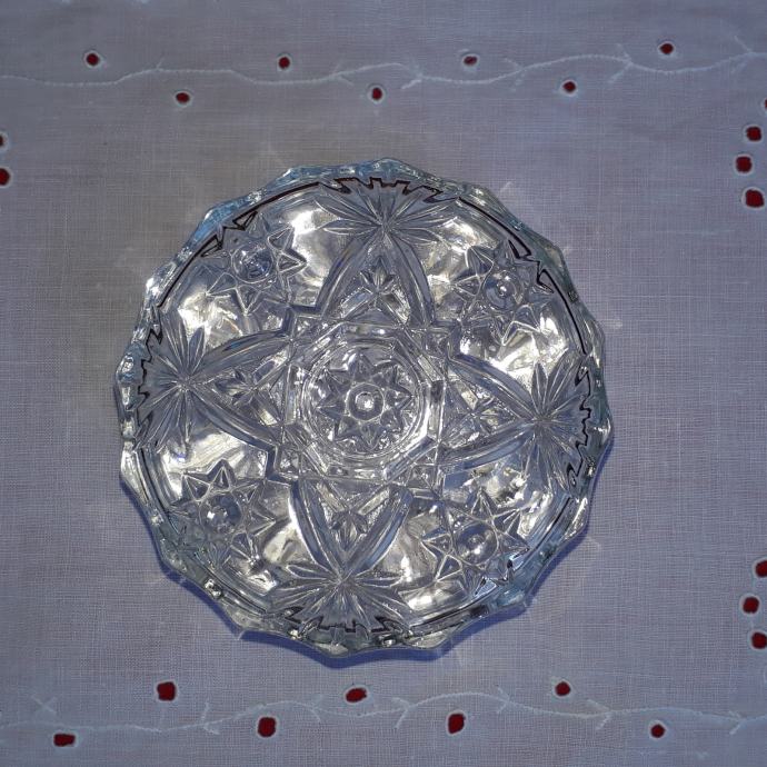 Posodica s pokrovom iz kristalnega stekla, uporabna za shranjevanje nakita, ali kot bonbončnica, lahko pa uporabite kot dve skledici za prigrizke. Premer 10,5 cm, višina 4,5 cm. Zelo lepo ohranjena.