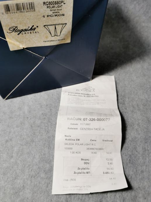 Skleda je dejansko nova, brez kakršnihkoli sledi uporabe, ves čas shranjena v originalni embalaži. Priložen je originalni račun iz leta 2007, kar potrjuje avtentičnost, izvor in starost izdelka. Kristal je izjemno čist, težak in lepo lomi svetlobo – značilnosti, ki so tipične izključno za pravi lead crystal.