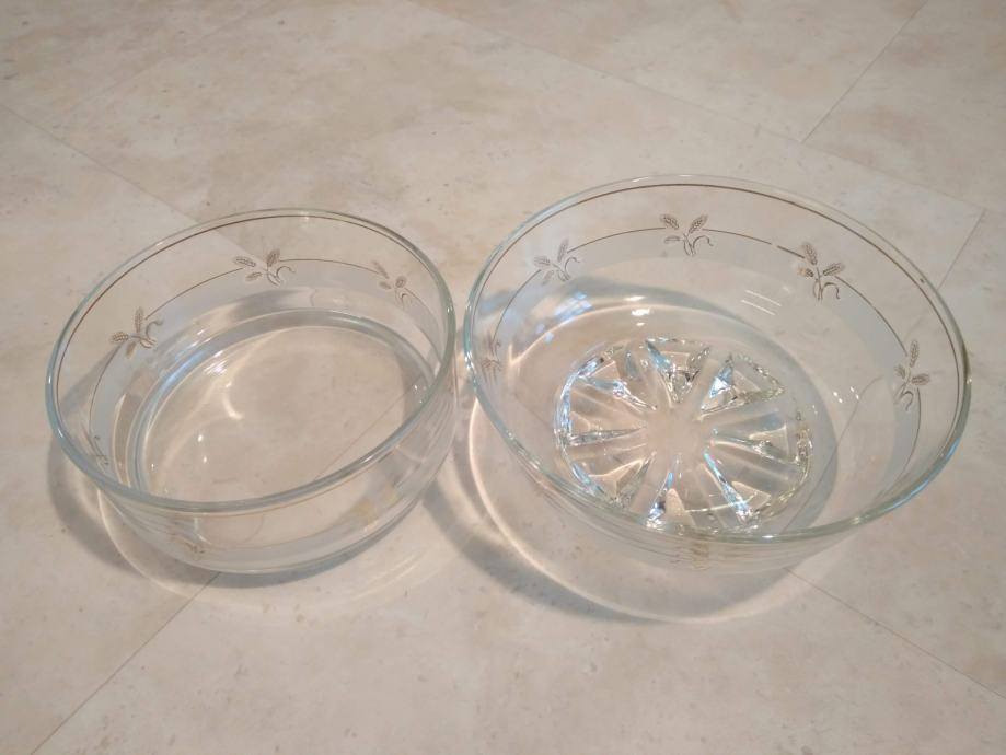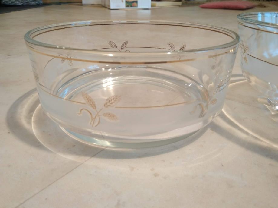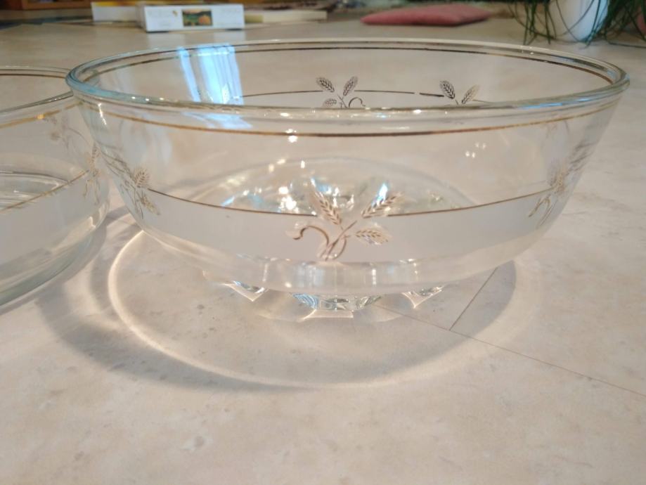 Skleda za solato, sadno kupo, kompot, bovlo, ...iz stekla. Skleda je okrašena z zlatim vzorcem pšenice ter zlatimi črtami. Na voljo sta dve skledi - večja (premer 21 cm, višina 9 cm) in manjša (premer 18 cm, višina 8 cm) cm. Obe sta dobro ohranjeni.