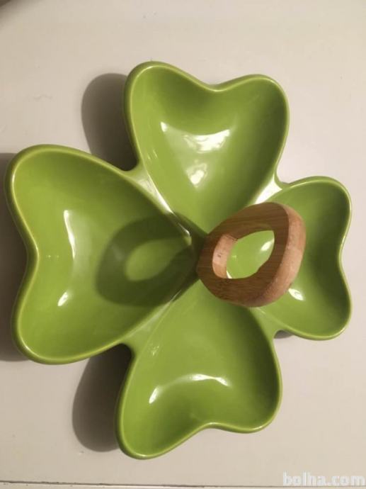 Skoraj nic rabljena, kot nova. Primerna za pecivo, slane prigrizge in se kaj. Keramicna stiri peresna deteljica, z lesenim rocajem.