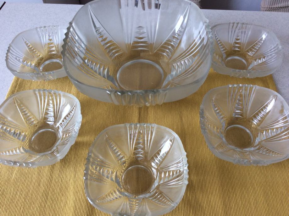 Prodam starejsi (1973) lepo ohranjen, stekleni komplet skledic z vecjo skledo, ki je primerna za kompot, puding, solato ...