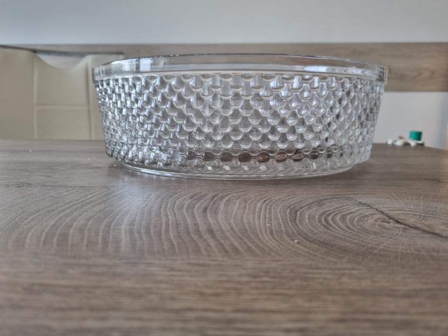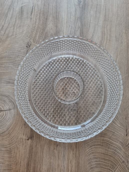 Prodam stekleno skledo, notranje stene gladke, zunanje oblikovane ( krogci) premer 31 cm, premer notranjega kroga 10 cm, visina sklede 10 cm, skleda tehta cca 4,3 kg, res masivno in kvaliterno izdelana. Na sredino se natrese led, ki ohlaja sadje ali zelenjavo, ki je nalozena okoli. Ivančna Gorica.