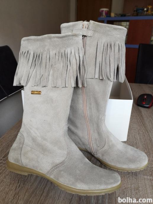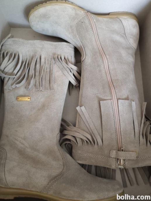 Prodam nove usnjene semiš dekliške škornje velikost 33 znamke La Perla, made in Italy. Škornji so visoki, zadrga je na notranji strani, podplat je guma, barva siva, materijal usnje, zgoraj resice okrasne. Izredno lepi. Ljubljana,
