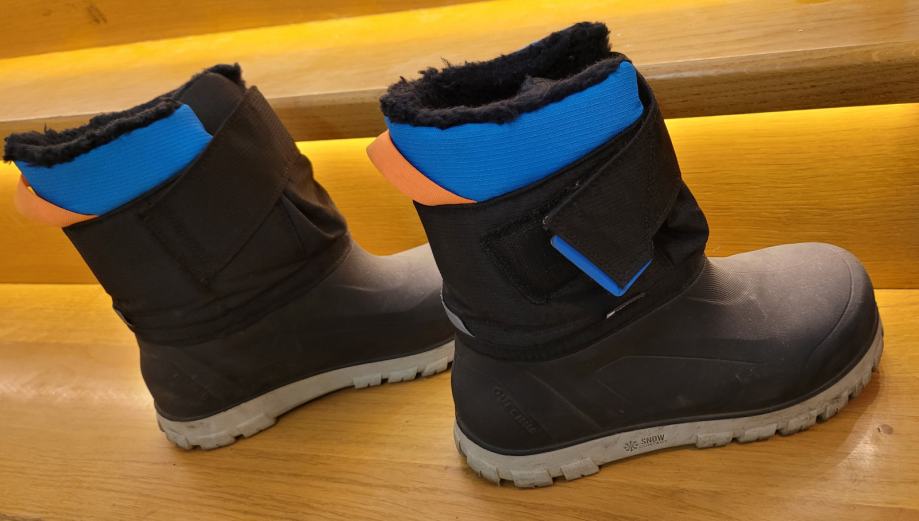 So topli, omogočajo enostavno obuvanje in imajo vodoodporen spodnji del. Črni, kombinirani z modro in oranžno. Velikost 37.