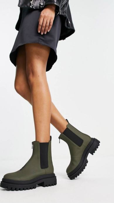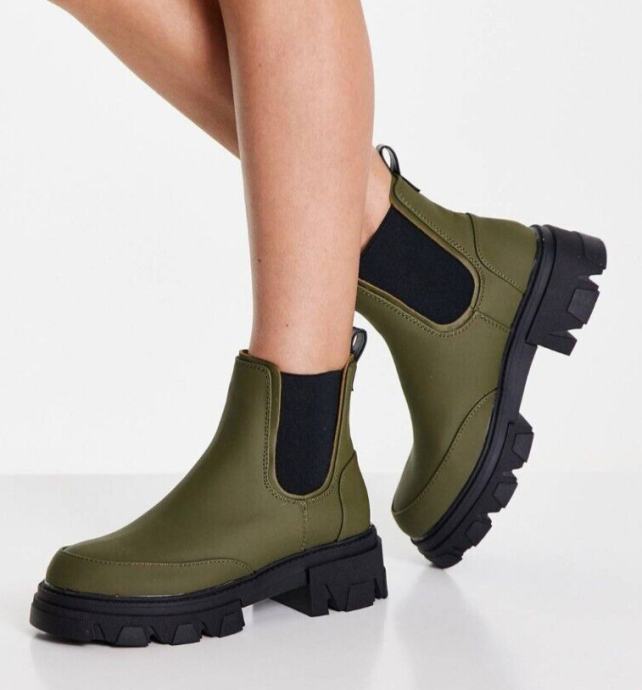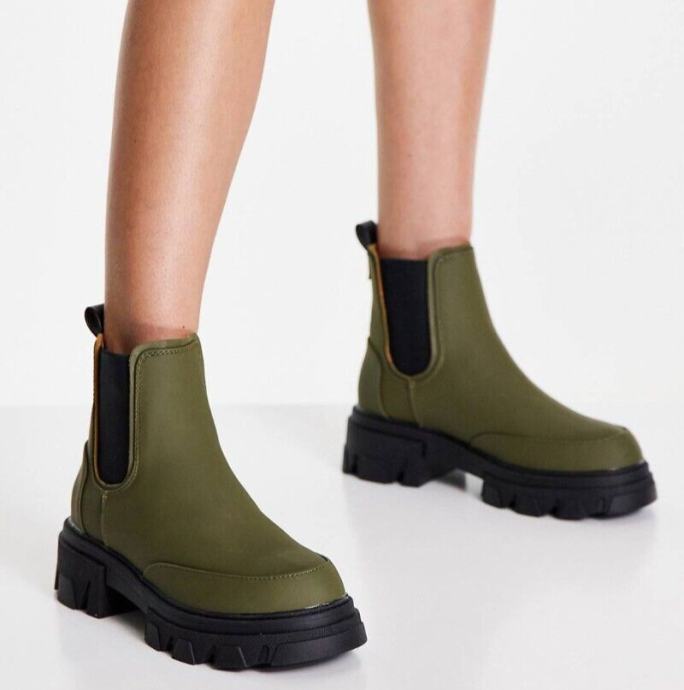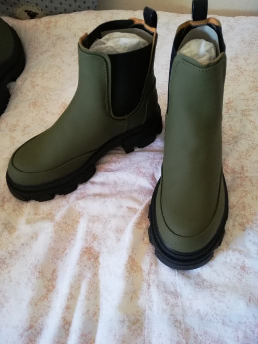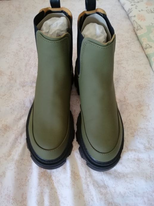Novi, nenošeni škornji v olivno zeleni barvi. Z elastičnimi vstavki ob strani za lažje obuvanje. Debel podplat, da vas ne bo zeblo.