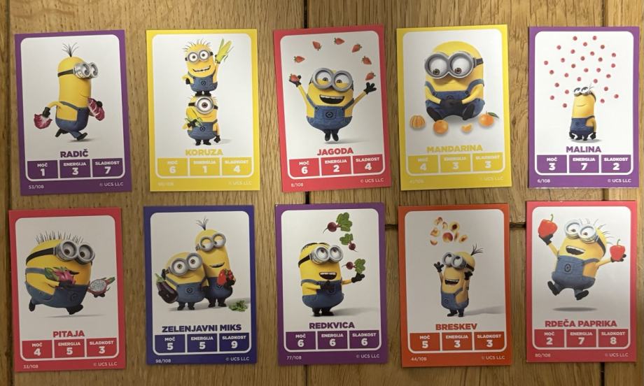 Prodamo minion kartice katere so namenjene zbiranju v albumu ali pa igranju družabne igre, kjer s karticami tekmuješ po moči, energiji in sladkosti.