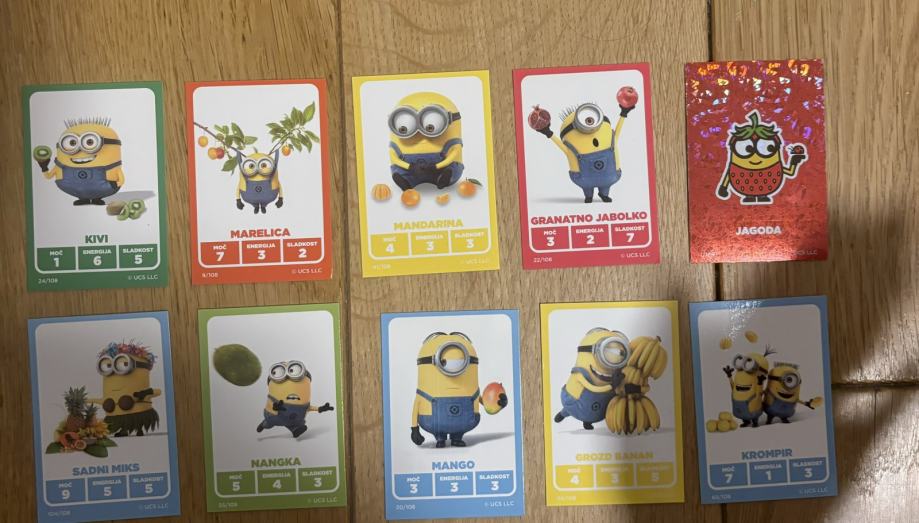 Prodamo minion kartice katere so namenjene zbiranju v albumu ali pa igranju družabne igre, kjer s karticami tekmuješ po moči, energiji in sladkosti.