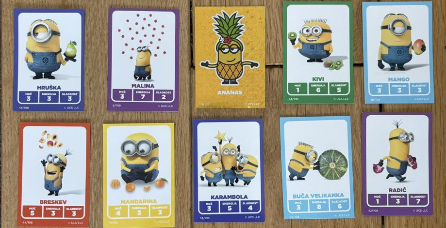 Prodamo minion kartice katere so namenjene zbiranju v albumu ali pa igranju družabne igre, kjer s karticami tekmuješ po moči, energiji in sladkosti.