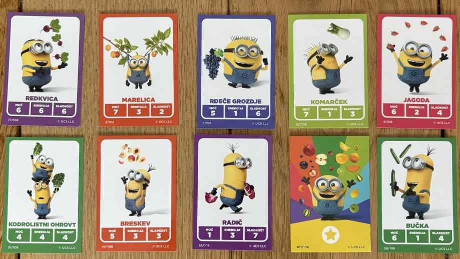 Prodamo minion kartice katere so namenjene zbiranju v albumu ali pa igranju družabne igre, kjer s karticami tekmuješ po moči, energiji in sladkosti.