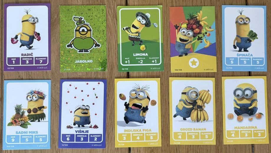 Prodamo minion kartice katere so namenjene zbiranju v albumu ali pa igranju družabne igre, kjer s karticami tekmuješ po moči, energiji in sladkosti.