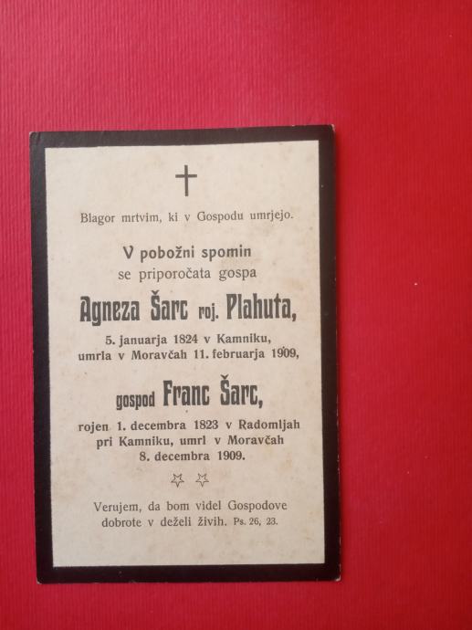 Kamnik.Radomlje,Moravče,spomin na pokojnika,Agneza Plahuta,Franc Šarc