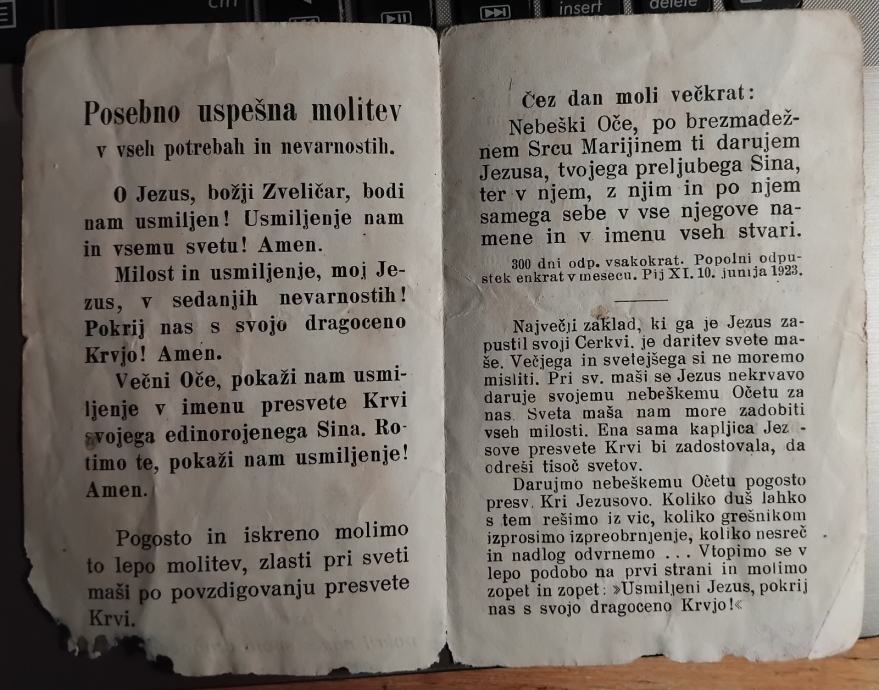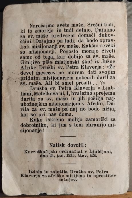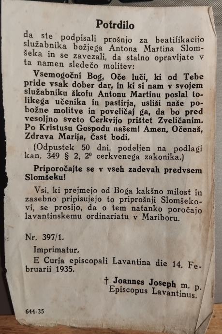 90 let stara Nabožna podobica izdana leta 1935 na 4 straneh in.POTRDILO da "ste podpisali prošnjo za beatifikacijo služabnika božjega Antona Martina Slomšeka". Oboje izdano leta 1935. Pošljem po pošti na stroške kupca.