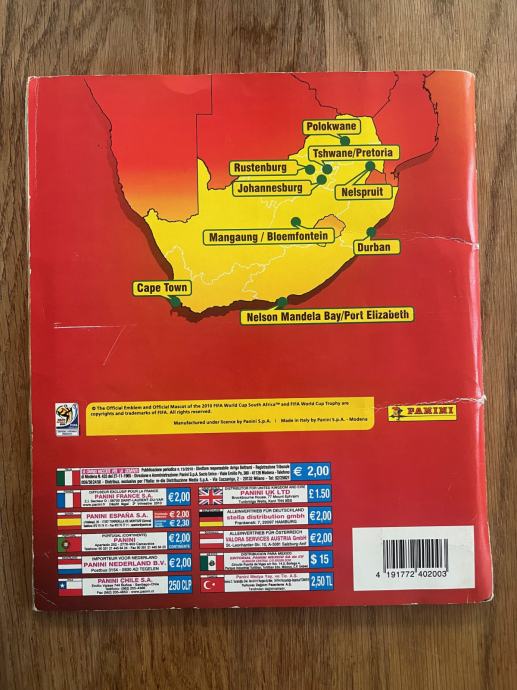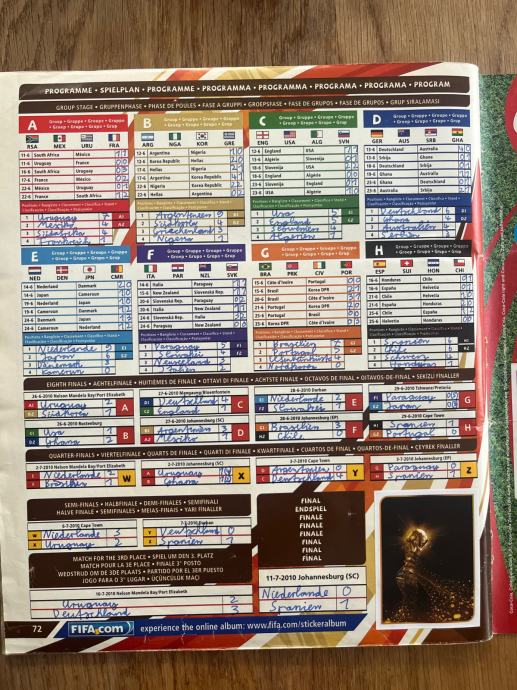 Prodam kompleten album Panini FIFA WORLD CUP 2010 South Africa, polepljen s sličicami in napisani rezultati v tabelo. Zunanje platnice so obrabljene. Prevzem Ljubljana Kodeljevo