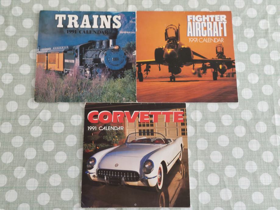 Prodam 3 stare stenske koledarje,letnik 1991 (vojaški avioni,vlaki in avtomobili Corvette)