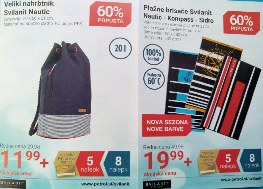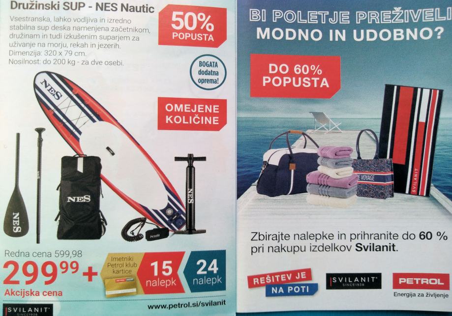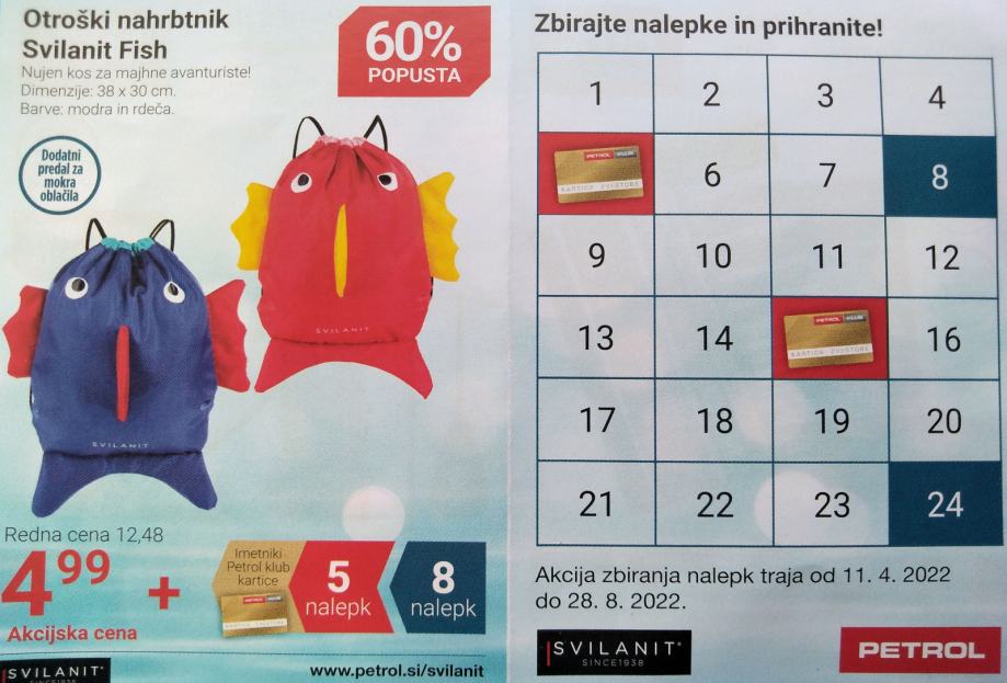 Imam 143 še nenalepljenih nalepk Petrol Svilanit. Z zbranim določenim številom nalepk lahko prihranite do 60% ob nakupu izdelkov Svilanit (brisače, potovalne torbe, nahrbtniki, družinski SUP,...)