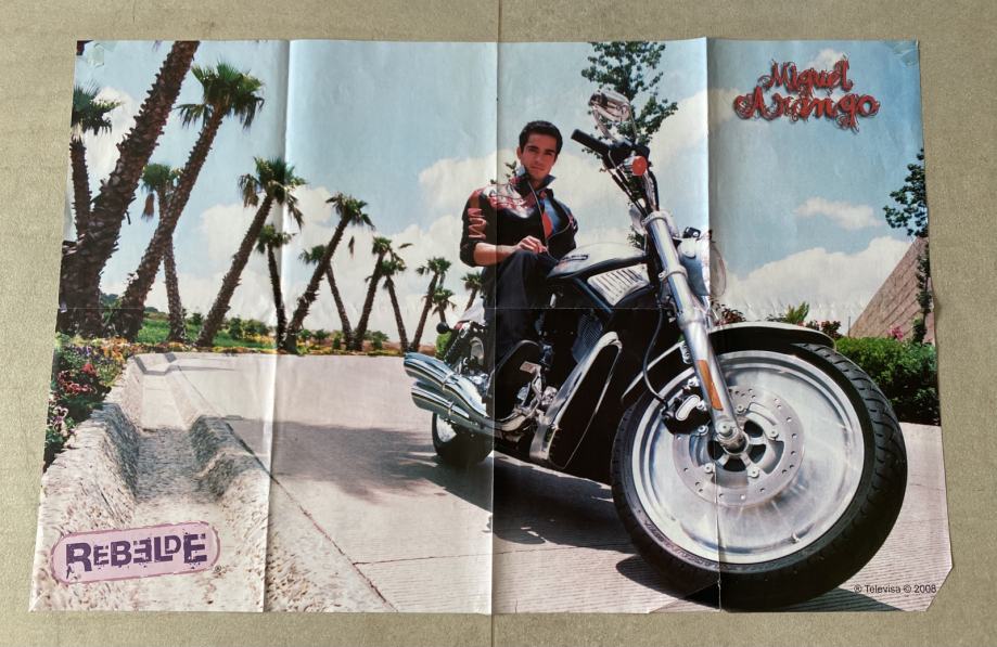 1x plakat - poster REBELDE - MIGUEL ARANGO (Alfonso Herrera Rodríguez) na motorju in s palmami v ozadju (REBELDE, Televisa)!