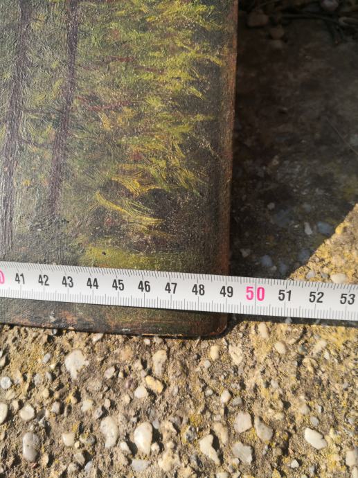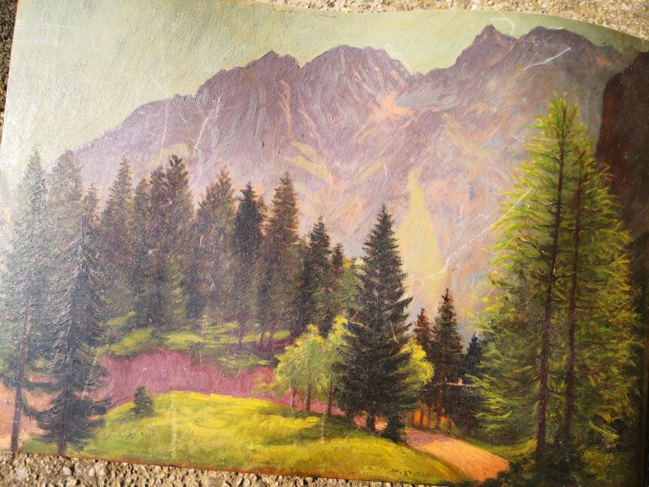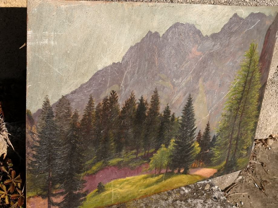 Prodaja se starinska slika pokrajine, Špik, gore, olje na kartonu - šperplati, zelo stara slika,,slovenski slikar, videti sledi uporabe, REDKOST!!, od zadaj piše Milan Klemenčič 1929,,,,mere ca 50x35cm,,