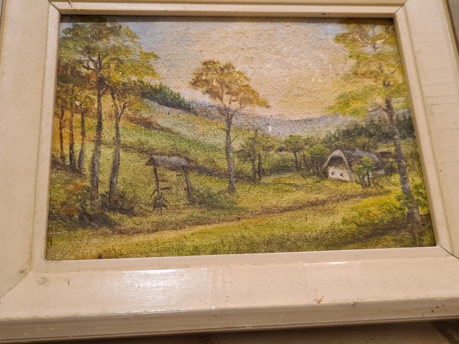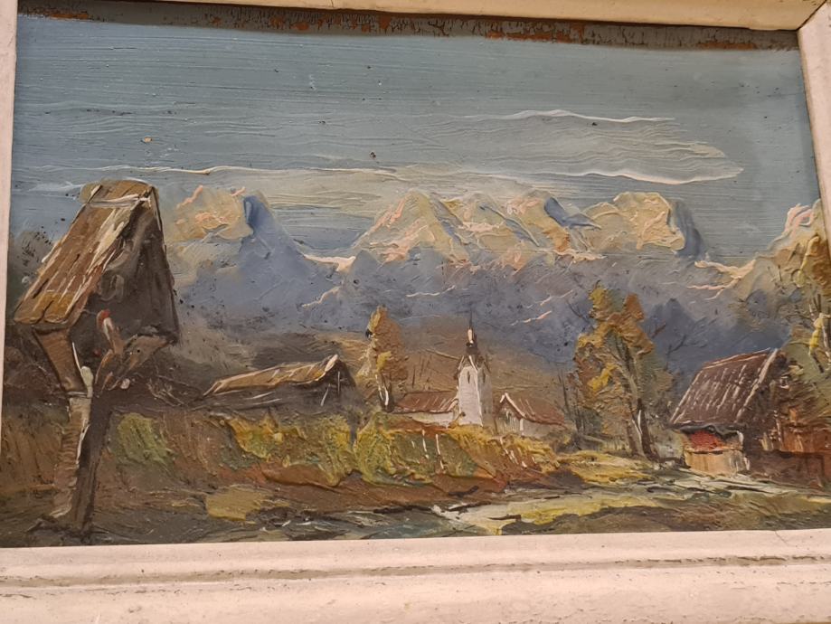 - slika gore,vas ,križ ,mere 36x26cm ,ne najdem podpisa,morda Gorlov? Josip Potočnik?Fran Klemenčič? - olje na vezani plošči,šperplati, slika na lesonit, - 199€,- NI VEČ!!,