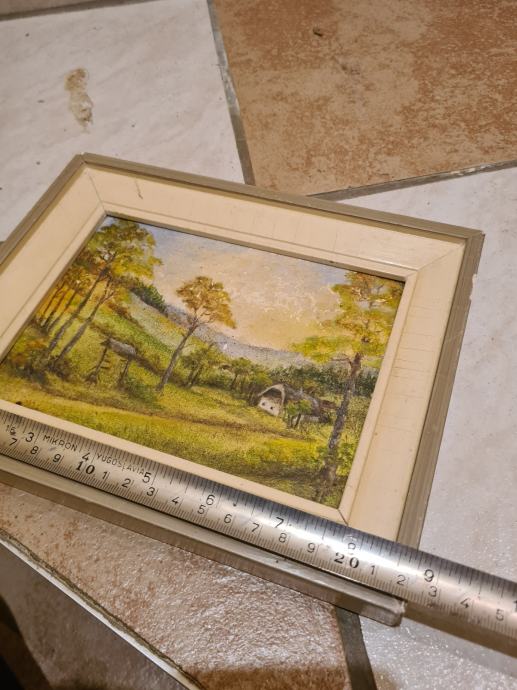 - manjša slika, Gozd,hiša,kozolec ,mere ca 22x18cm ,zelo stara slika šperplata, lesonit - 69€,
