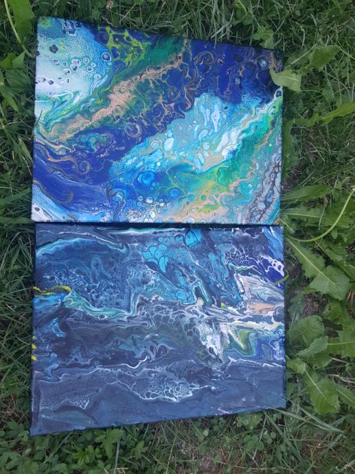 Prodam 2 abstraktne akrilne + metalik tempera slike, cena za obe eur . Slike so zaščitene s sprejem za ohranitev in zaščito barv.