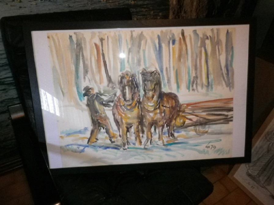 Lep akvarel od umetnika Lugariča, konjska vprega, dimenzija akvarela je pribl. 80x60 cm ................... slika je v začasnem okvirju.