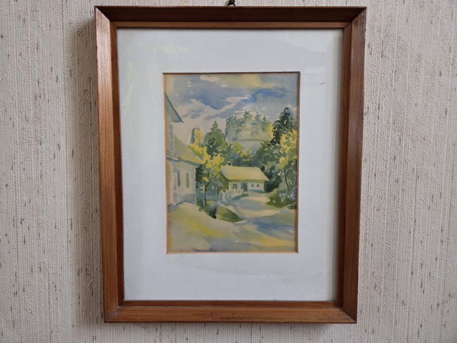 Prodam nežno akvarelno sliko s prikazom mirne podeželske ulice in hiš v poletnem vzdušju.