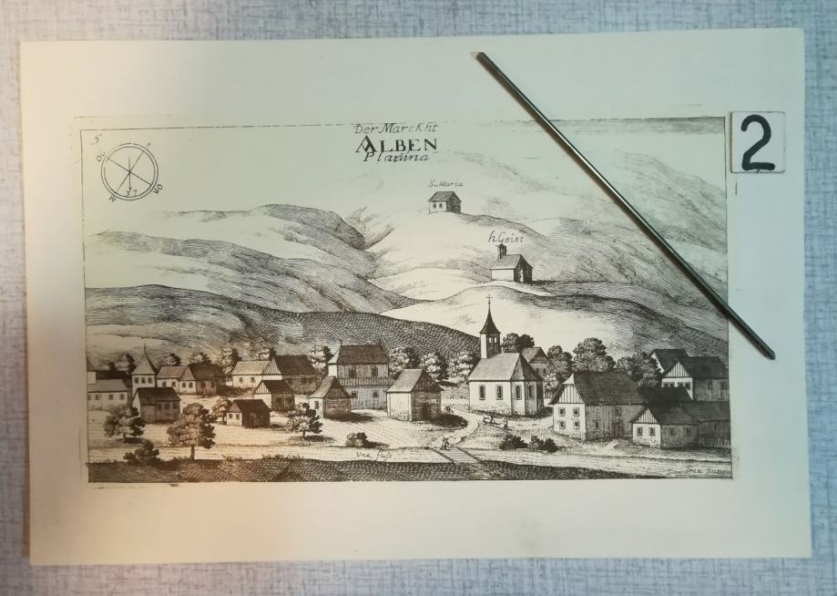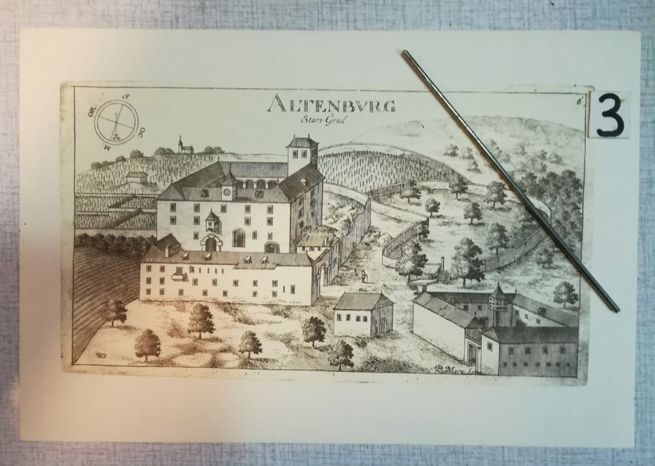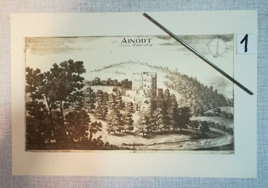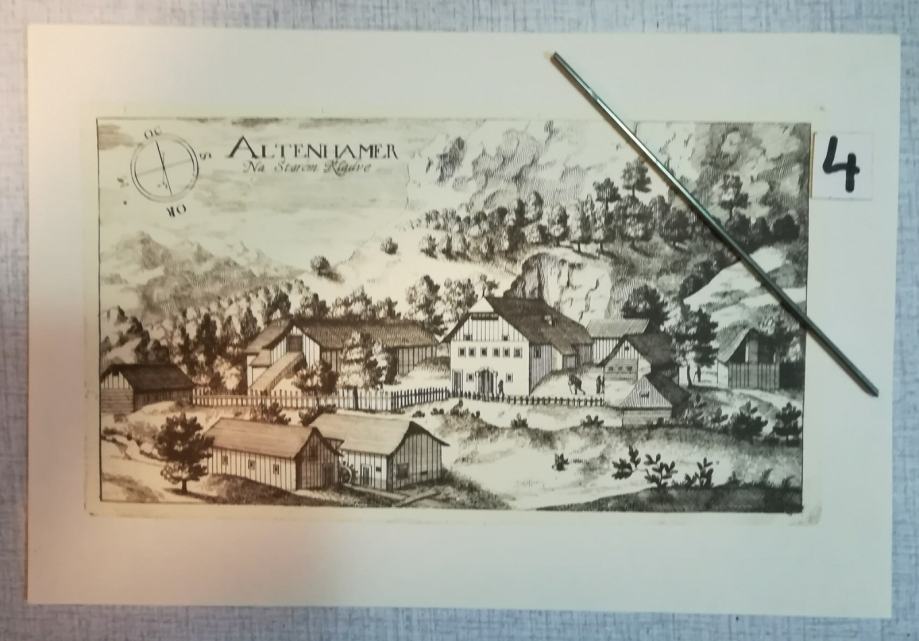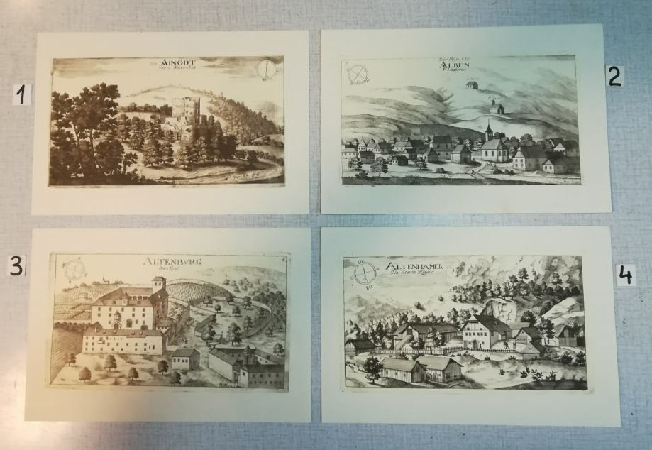 Prodam štiri bakrotiske J. V. Valvazorja. Slike bakrotiskov na listih so velikosti 21 x 12 cm, velikost listov pa je 25,5 x 17,5 cm. Ponatis bakrotiskov je iz leta 1970.