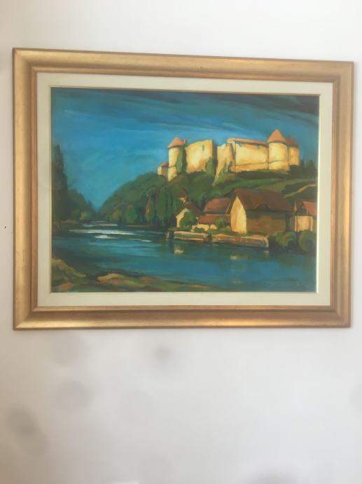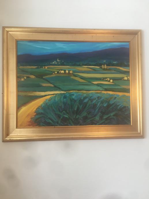 DVE UMETNIŠKI SLIKI AKRIL NA PLATNU , OKVIRJA POZLAČENA, 79 X 100 cm in 81 X 101 cm