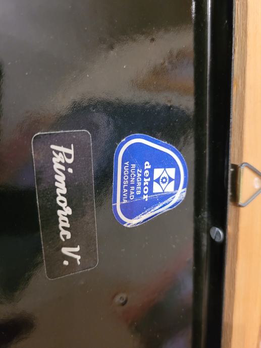 Slika je emajlirana, torej pleh z emajlom. Ročno delo jugoslovanske firme Dekor iz Zagreba.