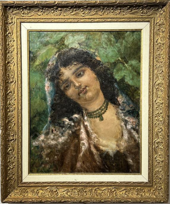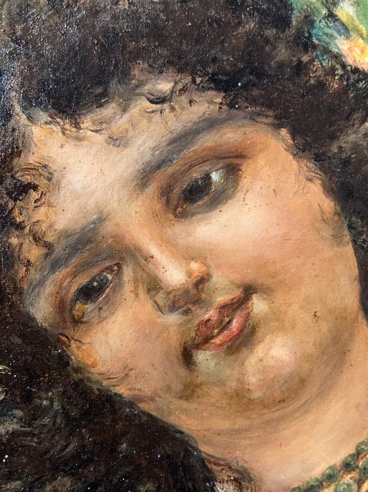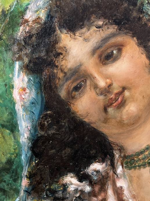 Prodam oljno sliko umetnika Giuseppe Uva (1874-1937) - Lepota med listjem, iz zasebne zbirke.