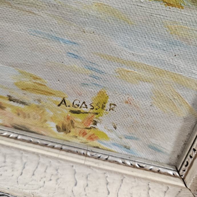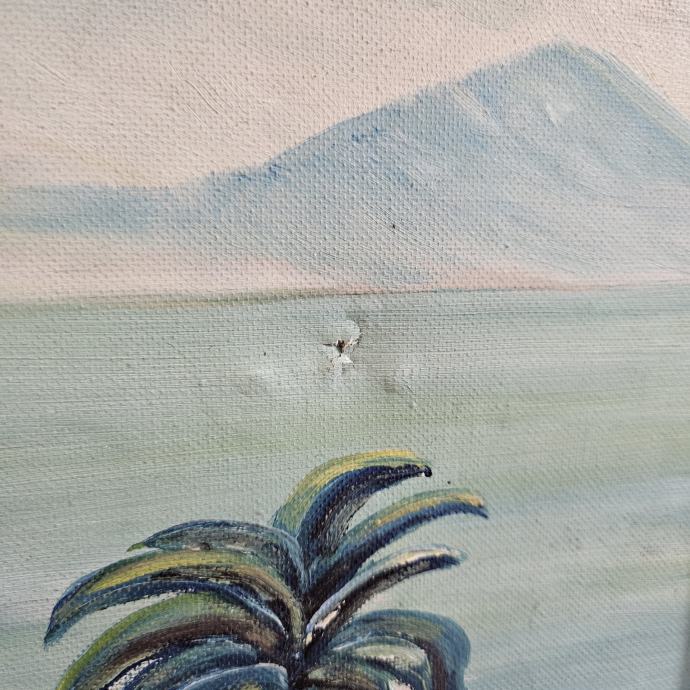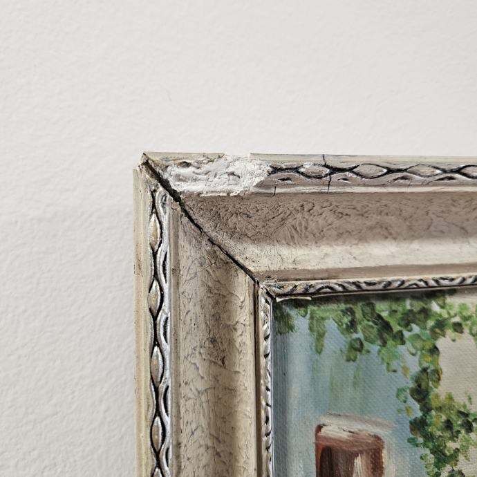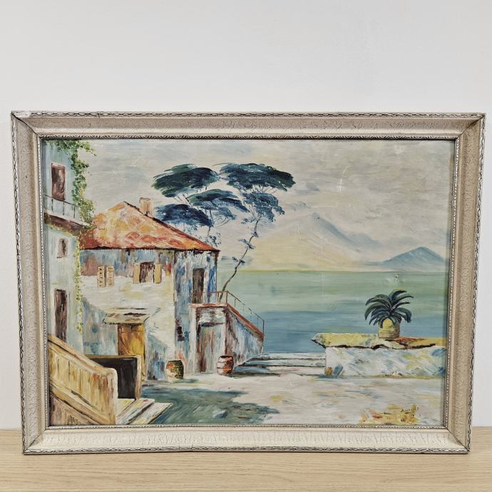 Prodam čudovito uokvirjeno oljno sliko s sredozemsko pokrajino. Slika prikazuje idilično obmorsko hišo, modro morje in slikovita drevesa, naslikano v toplem, rustikalnem slogu.