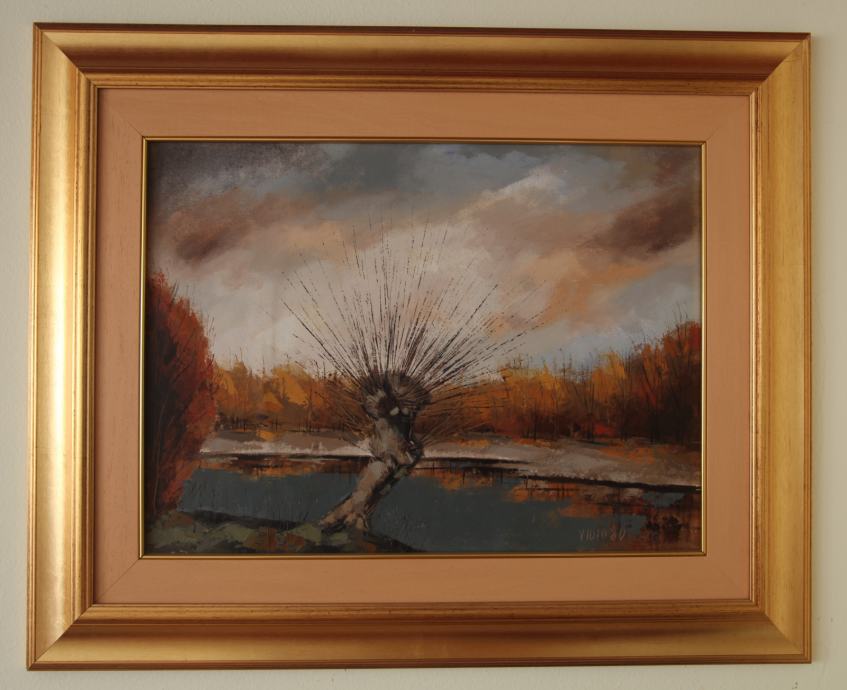 Izrazito atmosferično oljno delo priznanega slovenskega akademskega slikarja in ilustratorja Janeza Vidica, nastalo v njegovem zrelem ustvarjalnem obdobju okoli leta 1980. Slika upodablja enega najbolj značilnih in simbolnih motivov slovenske krajine – osamljeno, glavato vrbo ob mirni vodni gladini.
