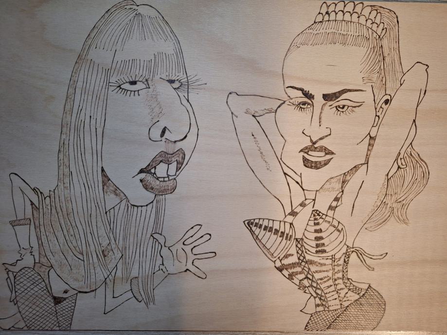 Prodam karikaturo pirografije ( žgano v les ) LADY GAGA in MADONNA.38 X 27 cm.