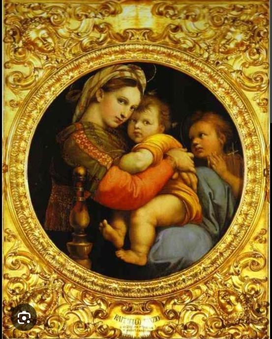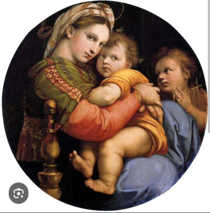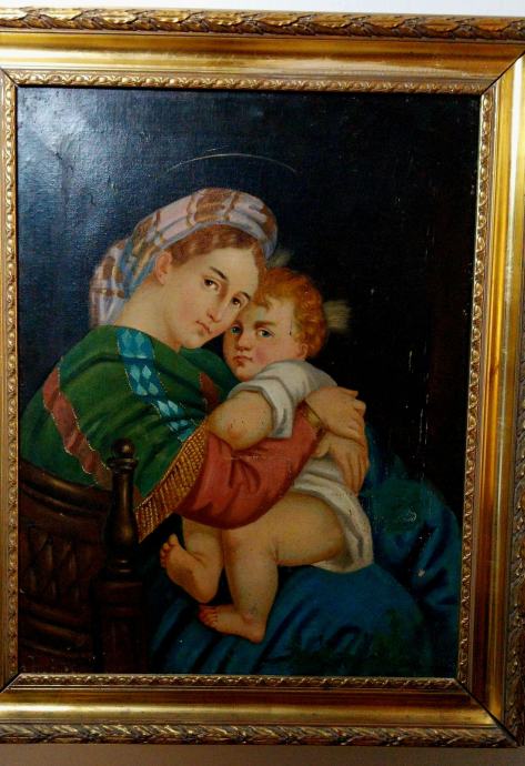 Kopija po Raffaello Santiju Marija z detetom, olje na platno 45 x 35. Ob primerjavi z originalom (priložen) vidno, da je avtor na tej kopiji zlasti dobro uprizoril Jezusa-dete sicer pa kot večina tovrstnih kopij dobro sledi originalu z nepretiranim patosom in brez sladkobnega "kiča" (pogled, oči glavnih likov....itd)