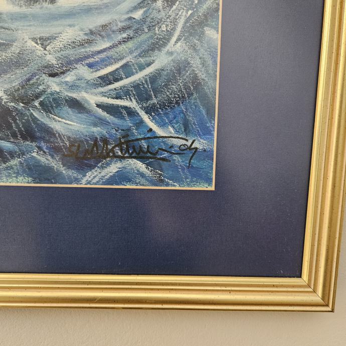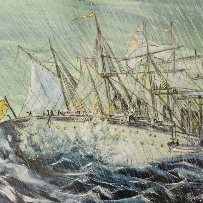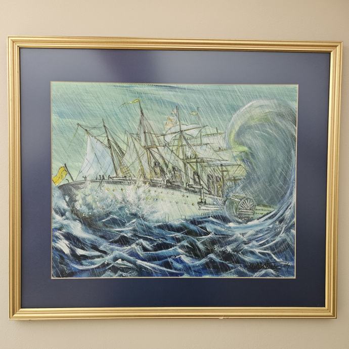 Čudovita oljna slika na platnu, ki prikazuje ladjo v neurju. Unikatno umetniško delo z dimenzijami 66 x 55 cm, uokvirjeno v eleganten zlati okvir. Odlično za popestritev doma ali pisarne!