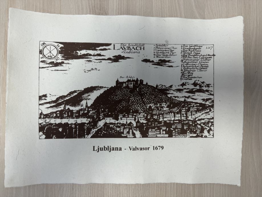 Odtis, grafika Ljubljane iz Slave Vojvodine Kranjske 1679, na ročno izdelanem papirju, mere 30 x 42 cm.